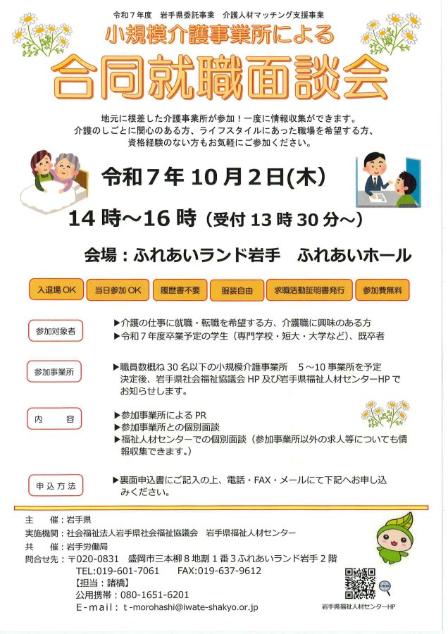 10/2(木)岩手県福祉人材センター主催の「令和7年度小規模介護事業所による合同就職面談会」に弊社も参加いたします!